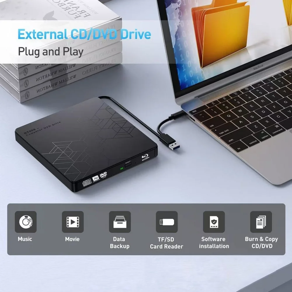 Multifunction Blu Ray Drive:This 5 in 1 blu ray player external offers versatile features, plug and play. It can read BD/DVD/CD discs and has 1 SD card slot, 1 TF card slot, and 2 USB 3.0 ports for data transfer or charging purposes. You can easily transfer music, blu ray uhd movies, and data files from SD cards, TF cards, or through the USB/Type-C ports to your computer. Additionally, you can transfer files from a external blu ray drive to an SD card, USB hard drive, or USB flash drive. Please note that you can only use either the SD card or the TF card at a time. However, both can function simultaneously with the 2 USB 3.0 ports.