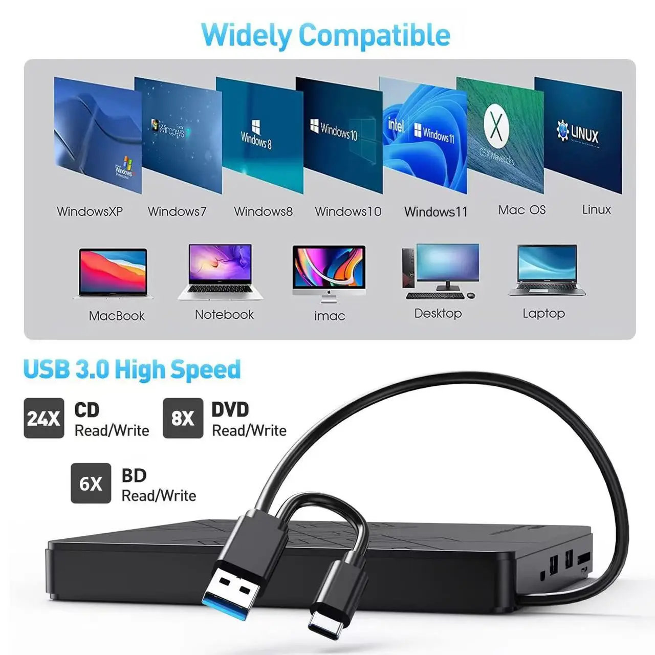 Portable Blu Ray Player: The unique design of our blu ray player for laptop combines both the drive and two different USB cables in one, and the usb bluray player features two concealed wire grooves that are specifically designed to store and carry both USB3.0 and Type-C interfaces. This feature helps users to easily store and transport the external usb blu ray drive without taking up too much space or risk losing one or both cables. The design is both stylish and functional, allowing for hassle-free connectivity and setup. With its innovative design and practical features, our Blu ray drive is an great choice for users seeking a reliable and versatile external optical drive.